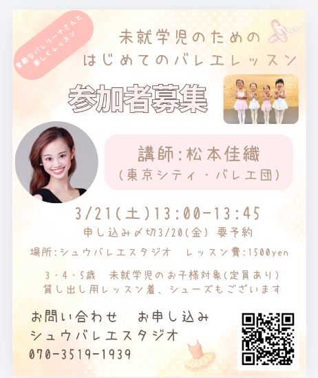 バレエに興味のあるお子様、身体を動かすことが好きなお子様、少し引っ込み思案なお子様でも大丈夫。プロバレリーナさんと一緒にレッスンを体験してみませんか?お申し込みはお電話か申し込みファームより受け付けています。